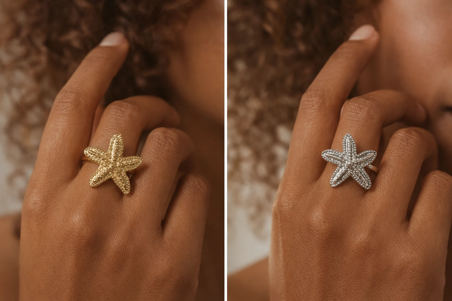 این مدلها به دلیل بافتِ دانهدانه و برجستهای که روی بازوهای ستاره دارند، حس طبیعی و دریایی فوقالعادهای را منتقل میکنند. انگشترهای طرح ستاره دریایی معمولاً نماد آرامش و تجدید قوا هستند.
