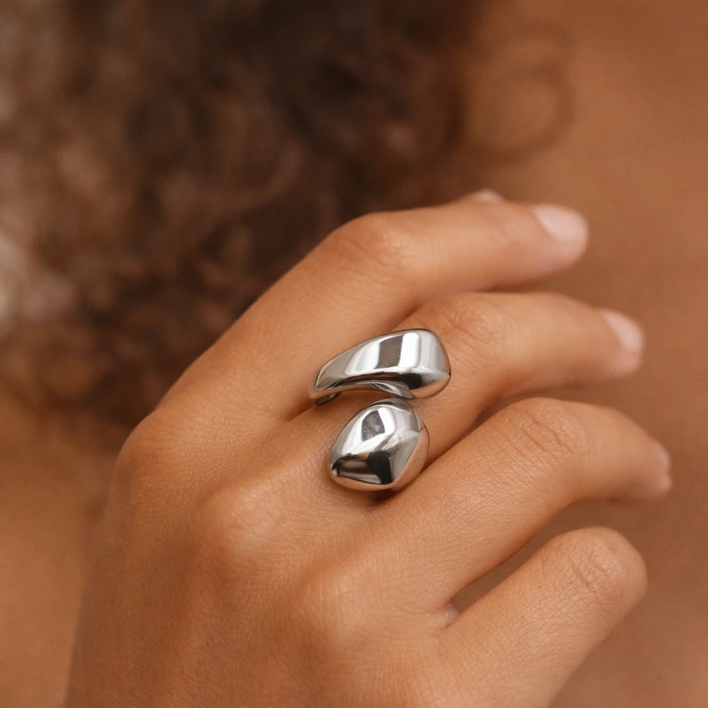 این انگشتر با طراحی منحنی و فرم آینهای، ظاهری منحصربهفرد و مدرن به استایل شما میدهد. سطح صیقلی و بدون لبهی آن باعث میشود نور را بهزیبایی منعکس کرده و بهعنوان یک اکسسوری مینیمال اما چشمگیر بدرخشد.